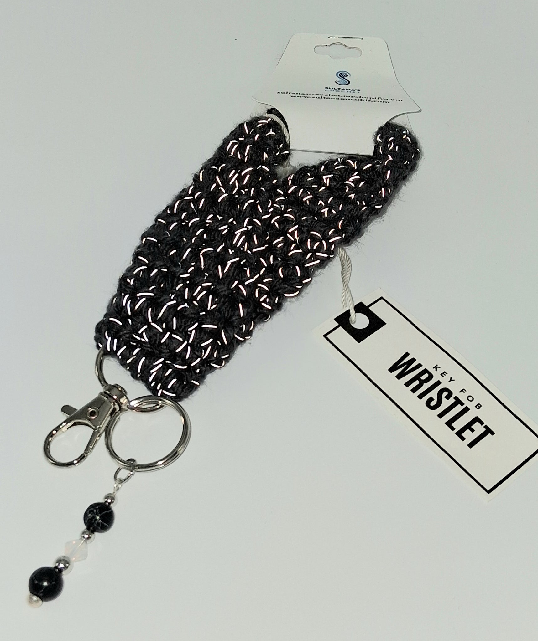 This handmade black, glow in the dark, key fob wristlet is the perfect accessory to add to your purse, tote bag, lap top bag or backpack. It’s crocheted with polyester yarn, has decorative glass beads and a stainless-steel key ring and lobster clasp so you can easily attach it to your bag.