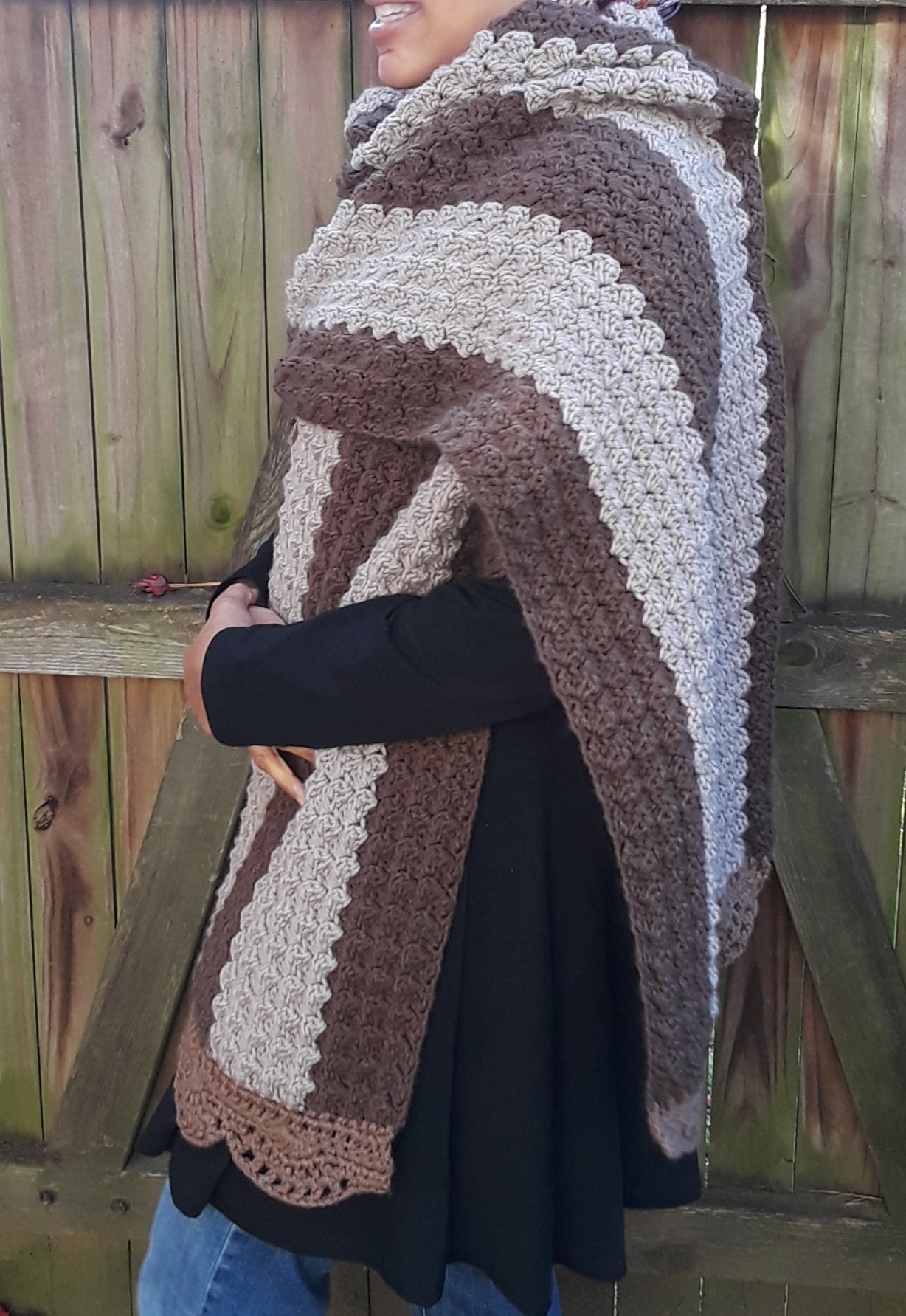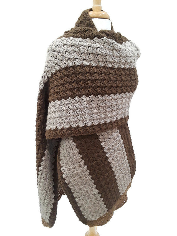 With cool weather approaching, this comfy bulky shawl is just right to snuggle up in to keep warm. This beautiful brown and beige mega shawl is just the thing that you need to spruce up your wardrobe. It's made with extra soft acrylic yarn. The coordinating stripes of brown and beige yarn and the shell stitch gives this piece a lovely pattern. It also has a large decorative shell edging on each end that adds a special accent to this shawl. As you are wearing it, you will surely stand out in the crowd. This handmade crochet wrap is the accessory that you need in your wardrobe. It makes a great gift too! (One Size Fits Most)