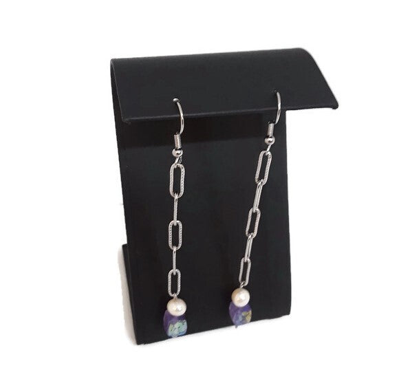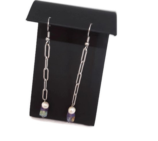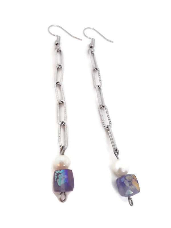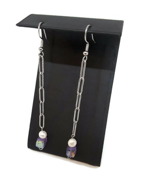 These beautiful and chic earrings are just right to add to your wardrobe. They're handmade with Amethyst Cube Beads, White Cultured Pearls, and Stainless Steel Chain. They have Stainless Steel Ear Wires and have approximately a 3 inch drop (not including the ear wire). You will definitely stand out in the crowd and make a big statement wearing these unique and elegant earrings. By the way, they would be an awesome gift too!