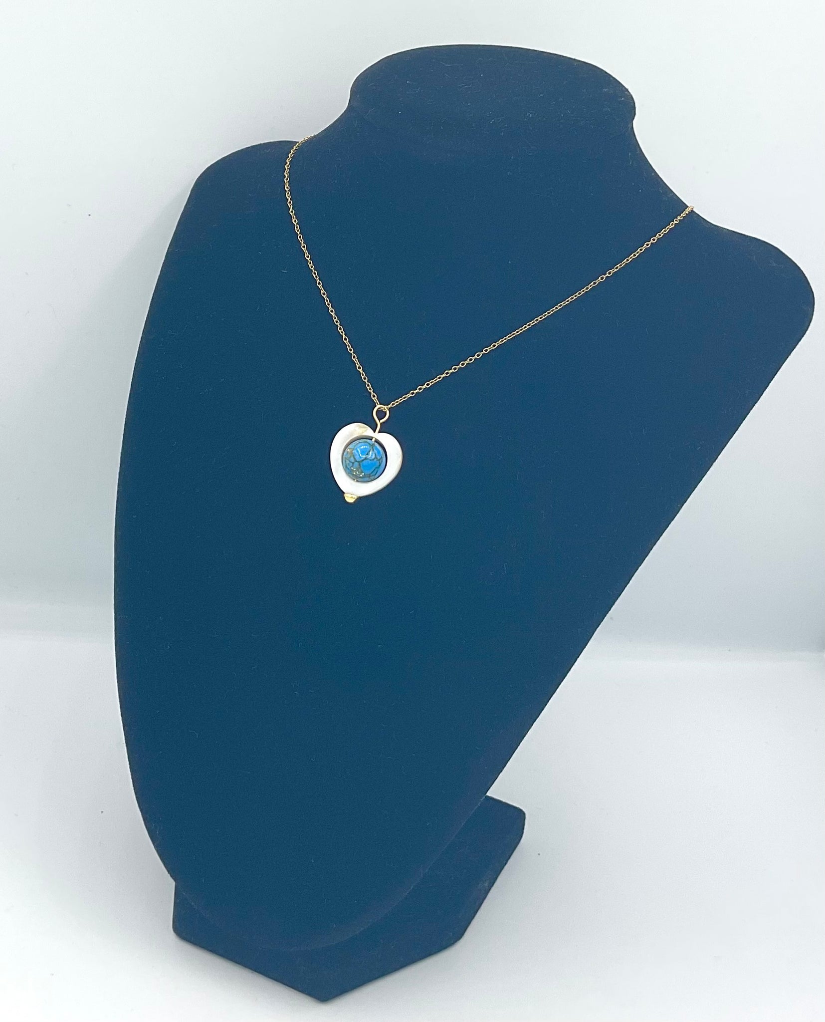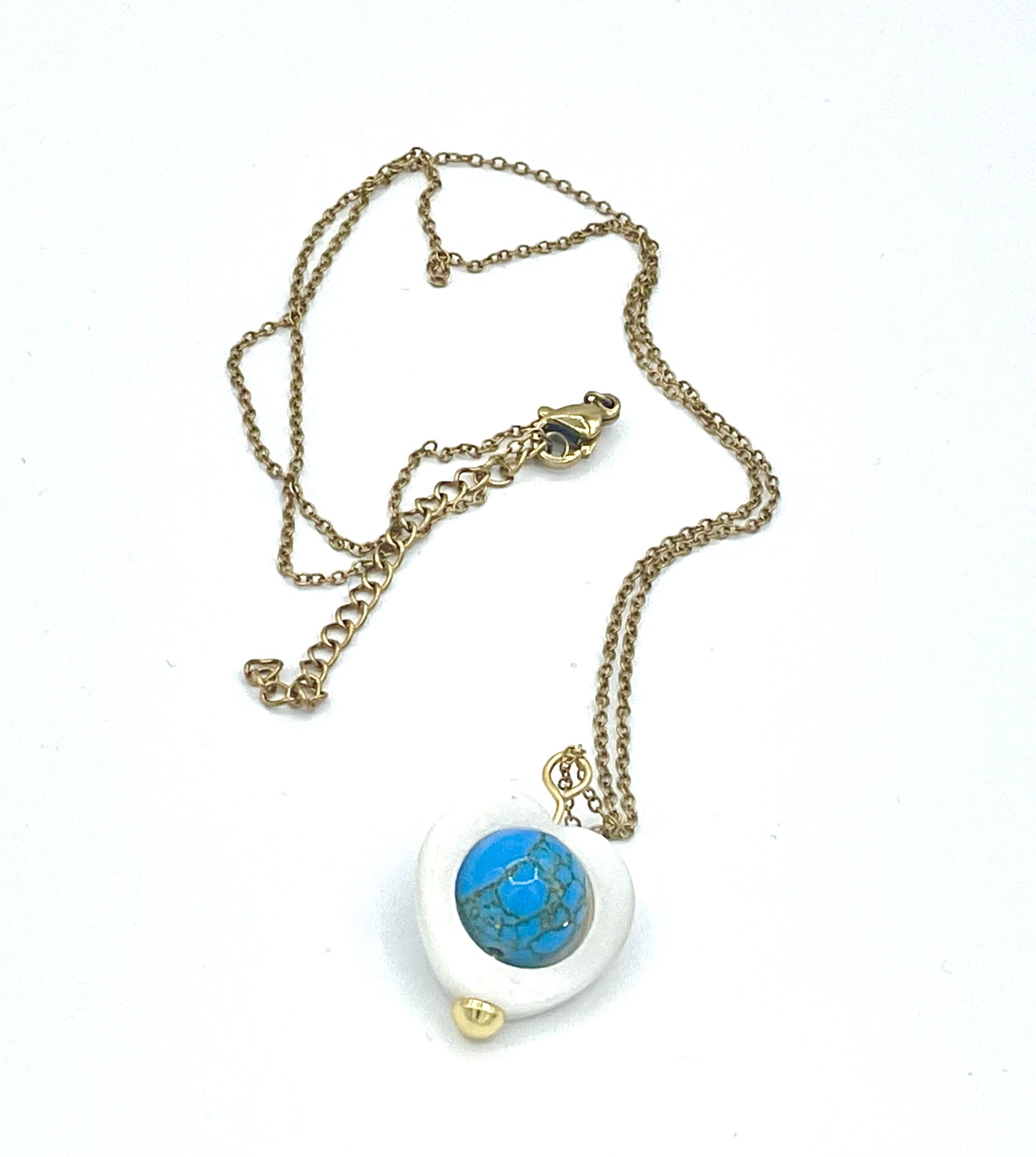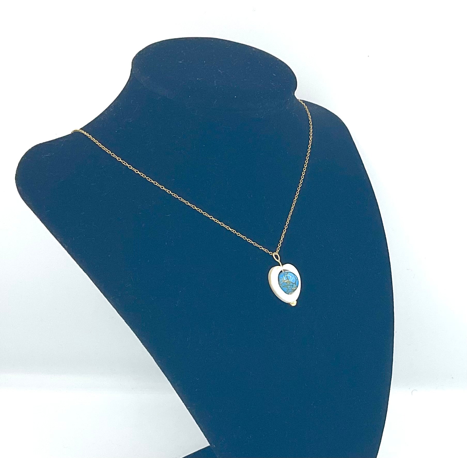 Does your mom like to have her own distinctive style? If the answer is yes, then imagine giving her this beautiful handmade, one of a kind jewelry set for Mother's Day. The necklace is made with Dolomite Gemstone Beads and they are set in a Heart Shape Mother of Pearl Frame. The chain is 18k gold over stainless steel and is 18 inches (45.72cm) with a 2 inch (5.08cm)extender.
