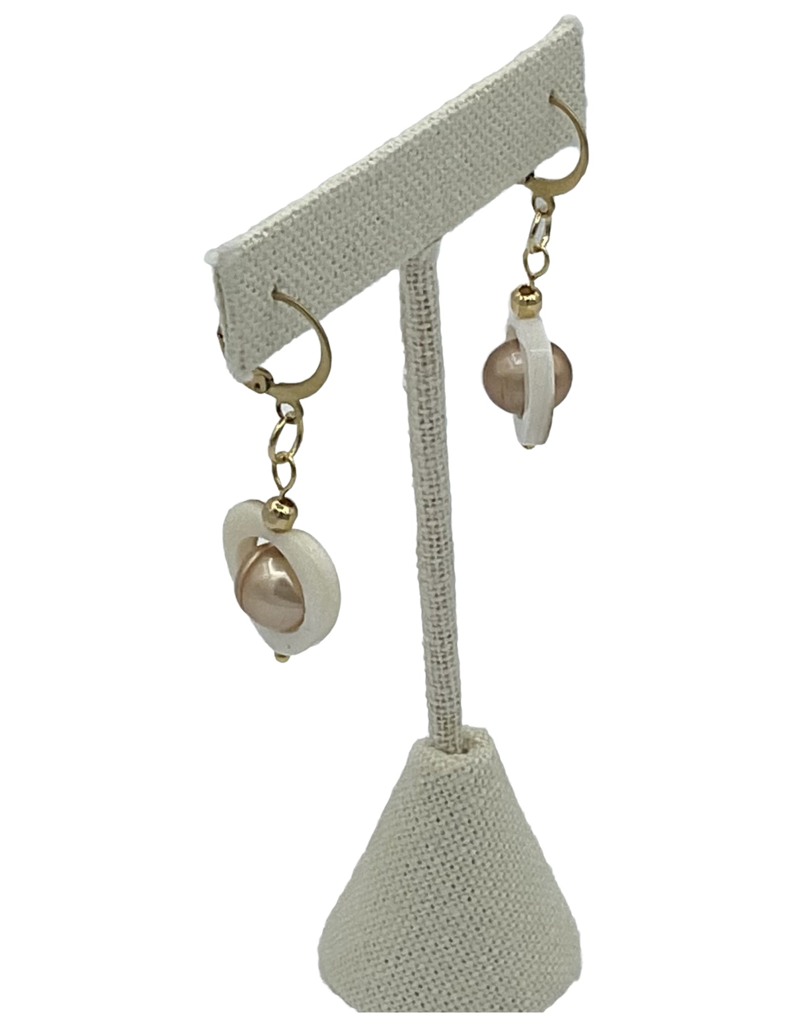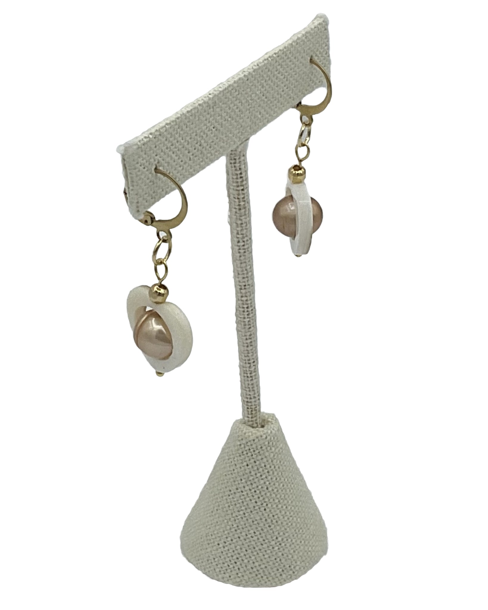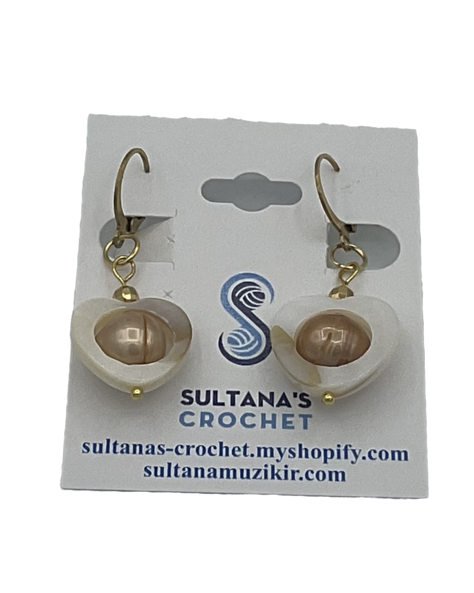The earrings are also Fresh Water Pearls set in a Heart Shape Mother of Pearl Frame. The ear wires are 18k gold over stainless steel. They have a 1 inch (2.54cm) drop, not including the ear wire.