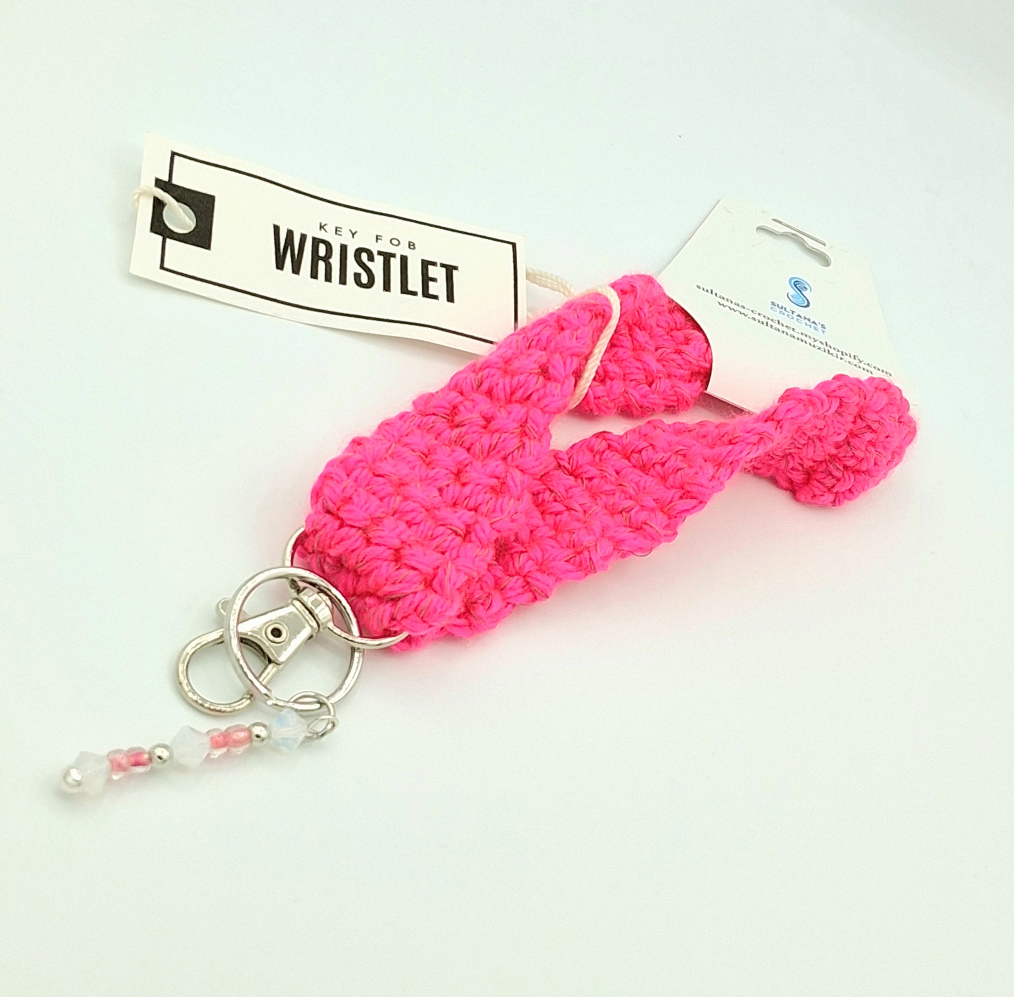 This handmade hot pink, glow in the dark, key fob wristlet is the perfect accessory to add to your purse, tote bag, lap top bag or backpack. It’s crocheted with polyester yarn, has decorative glass beads and a stainless-steel key ring and lobster clasp so you can easily attach it to your bag.