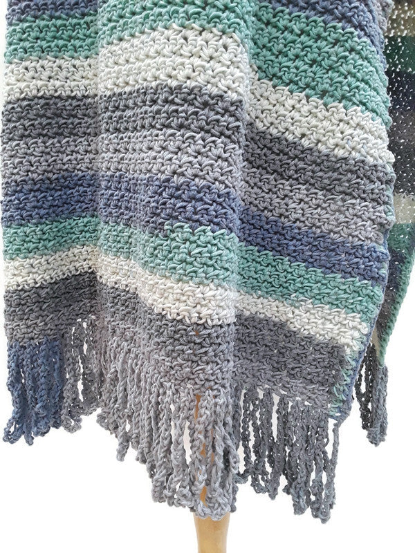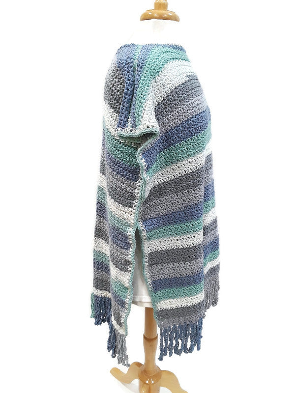 With cool weather approaching, this comfy poncho is just right to keep you warm on those brisk days. The beautiful stripes of hydrangea colors add some extra interest to this poncho design. It would be an awesome addition to elevate your Fall or Winter wardrobe. The multi-color tassels give this boho chic poncho extra movement and style. If you love standing out in the crowd, you will definitely love wearing this awesome handmade crochet poncho. (One Size Fits Most)