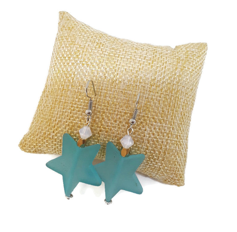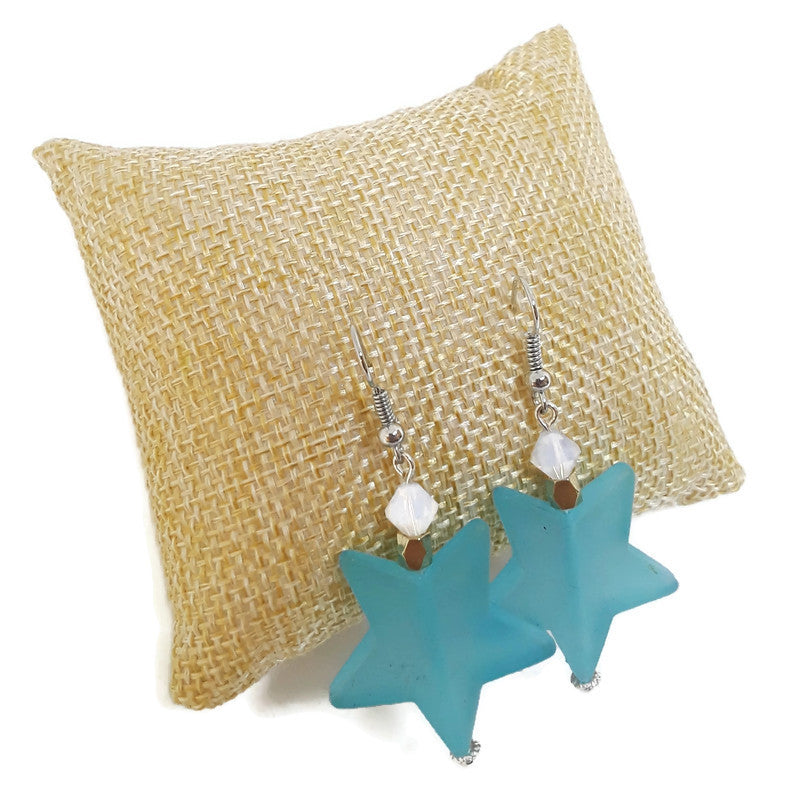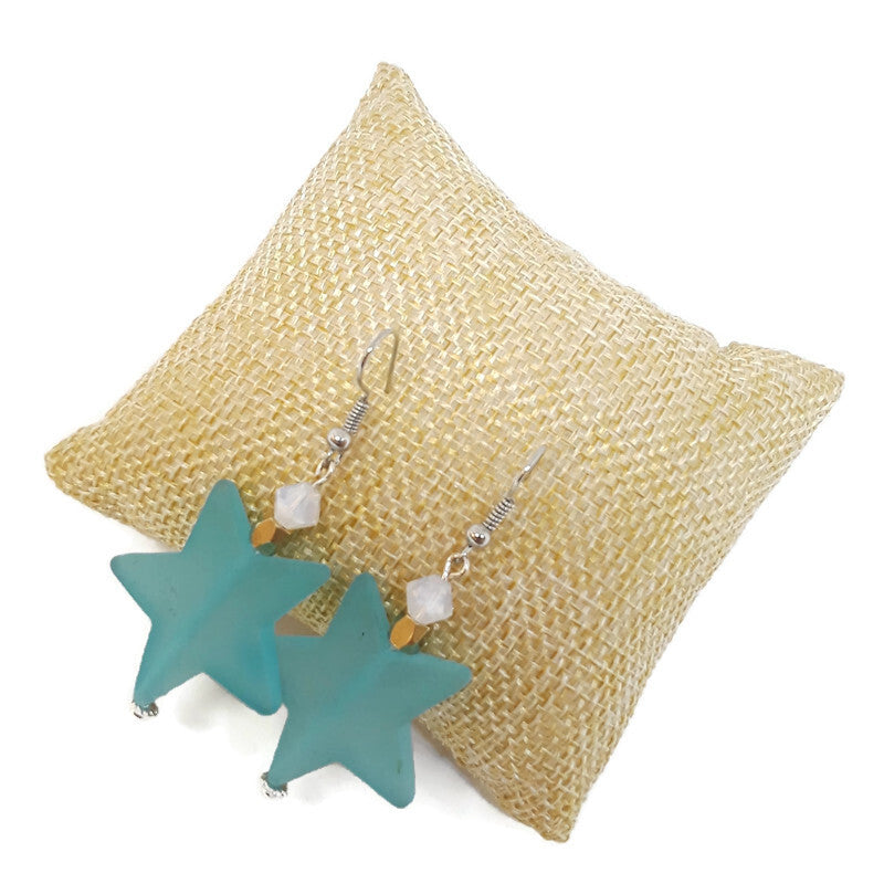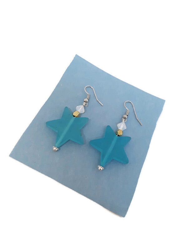 These beautiful boho chic Light Blue Star Resin Bead Earrings are just the right thing to add to your wardrobe. They are handmade with Star Resin Beads, White Faceted Czech Glass Beads, and Silver Tone Faceted Cube Beads. They have Stainless Steel Ear Wires which are Hypo-Allergenic and have a 1 3/4 inch drop. You will definitely stand out in the crowd wearing these unique and whimsical earrings.