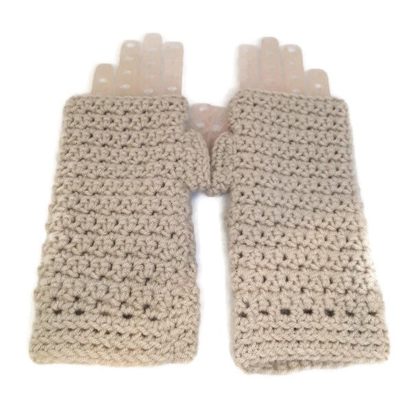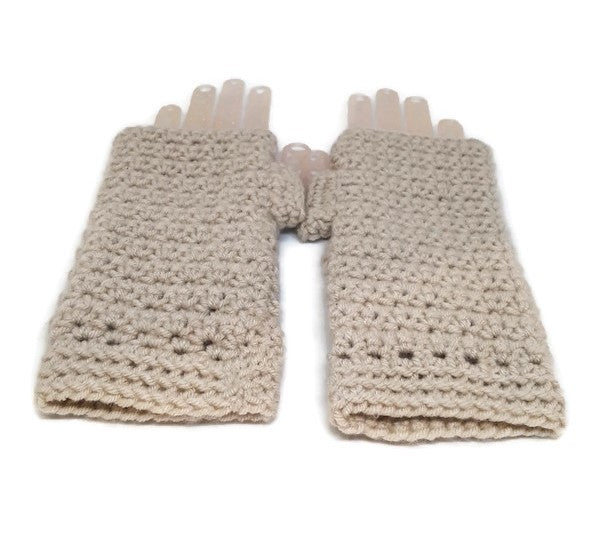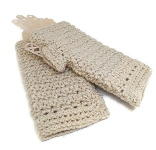 These gloves are crocheted with soft acrylic yarn and are very comfortable for everyday wear while driving, riding your bike, going for a walk, etc. The neutral ivory color can complement any outfit and the textured cuff adds some special interest to the design. In addition, they are easy to care for because they are machine washable and dryable. These beautiful handmade fingerless gloves are the perfect addition for your wardrobe.