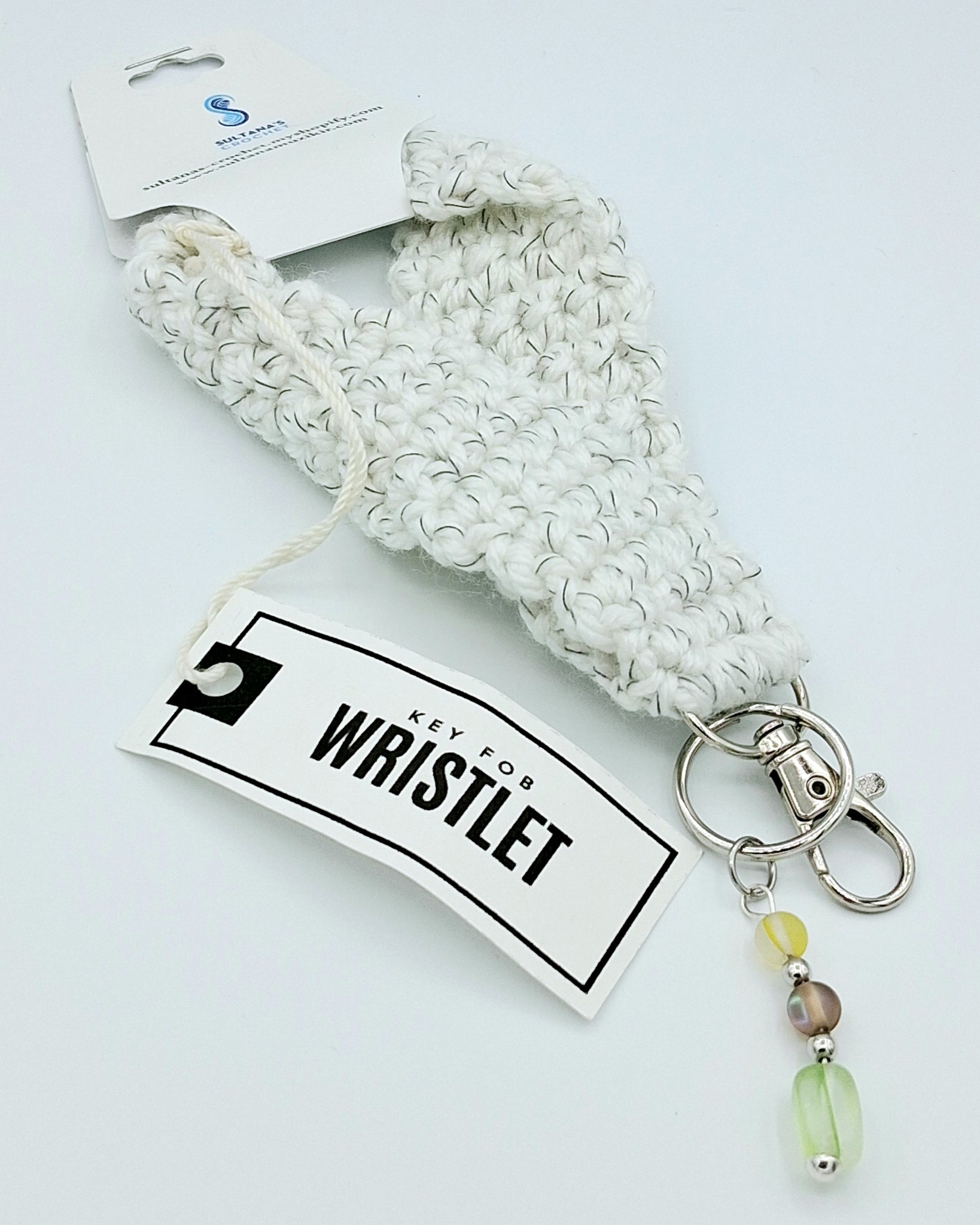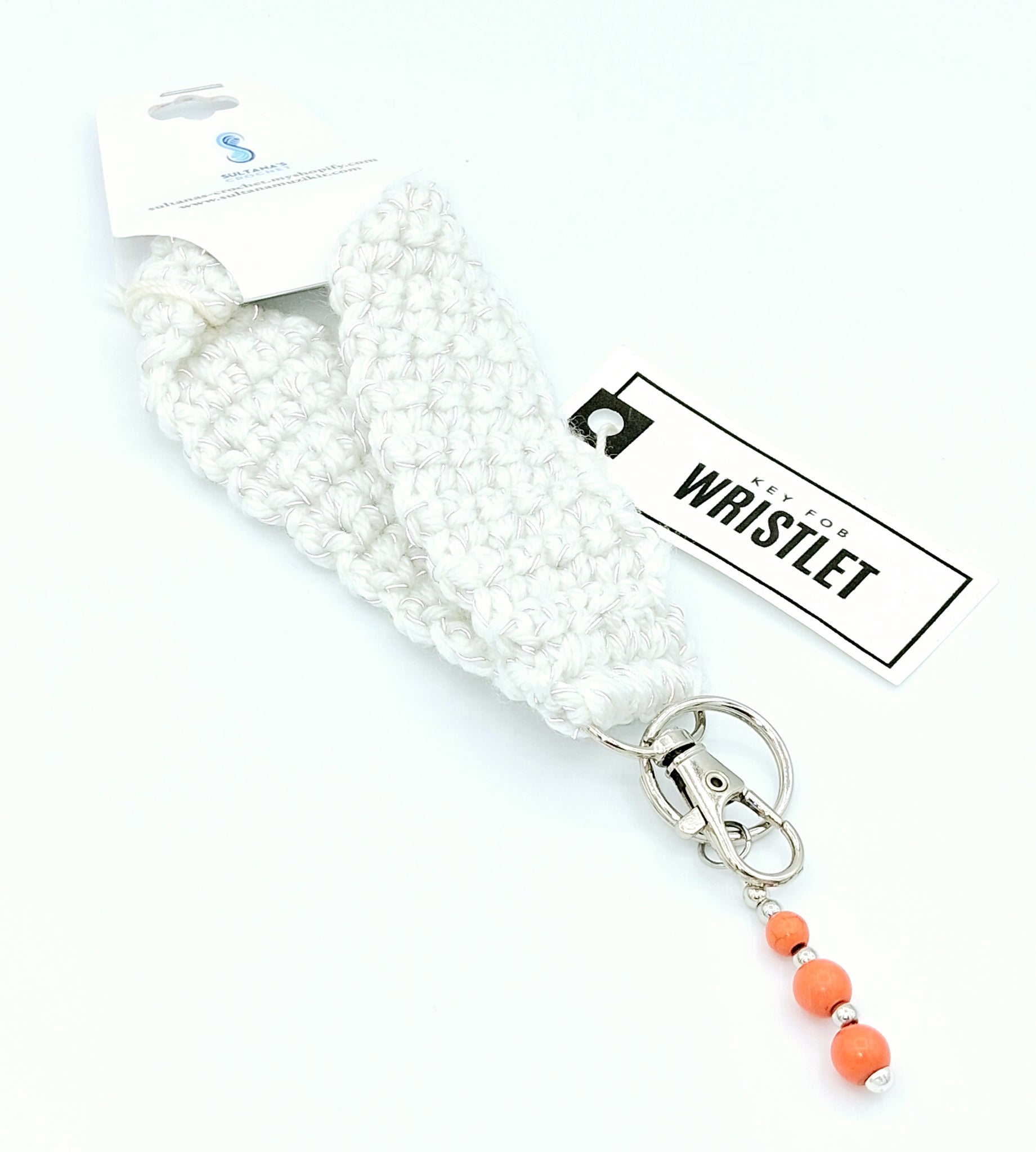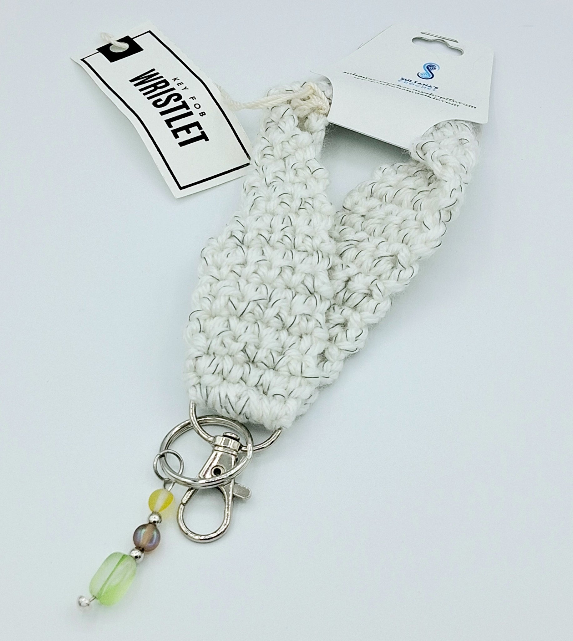 This handmade white, glow in the dark, key fob wristlet is the perfect accessory to add to your purse, tote bag, lap top bag or backpack. It’s crocheted with polyester yarn, has decorative glass beads and a stainless-steel key ring and lobster clasp so you can easily attach it to your bag.