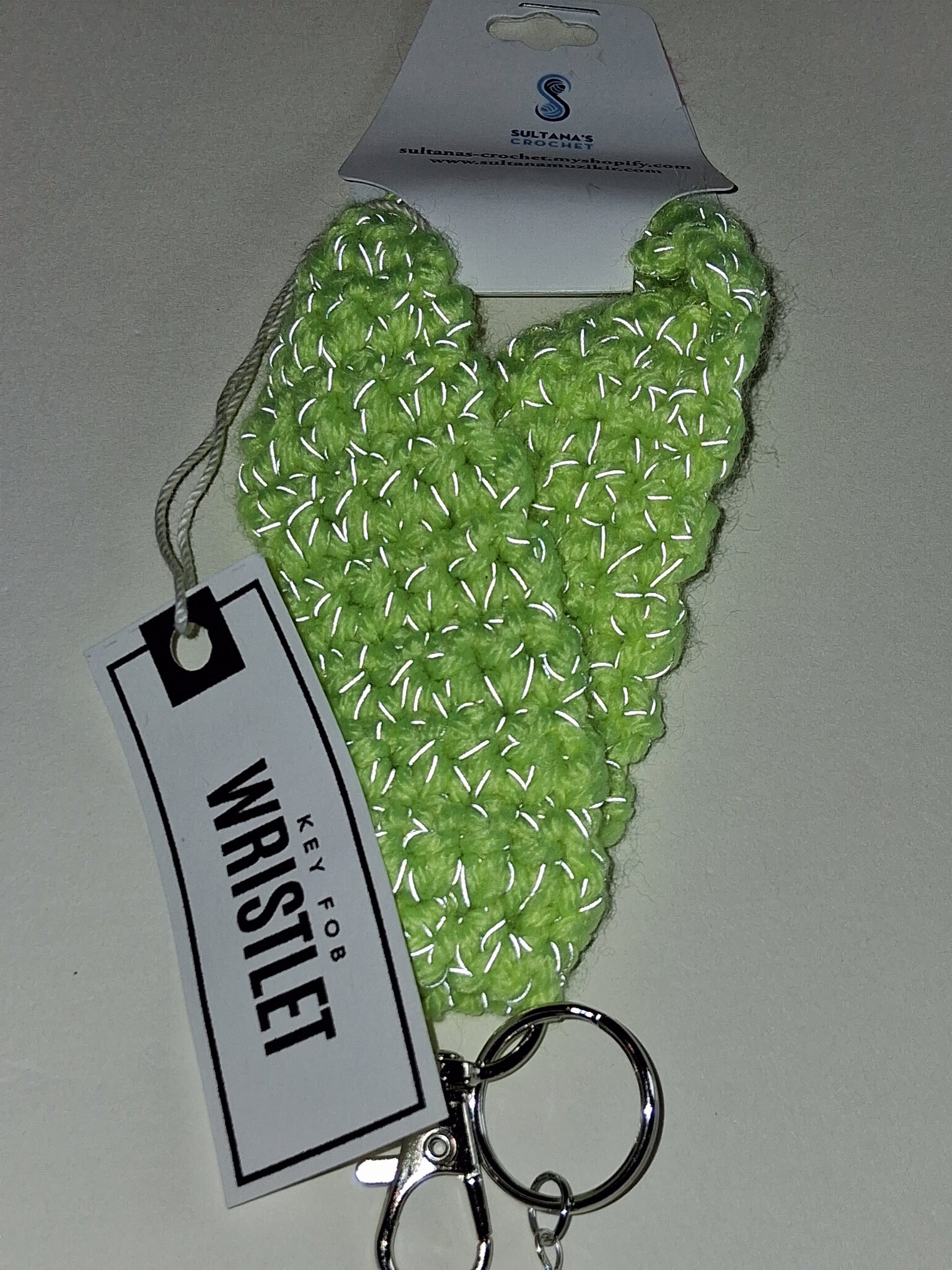 This handmade yellow, glow in the dark, key fob wristlet is the perfect accessory to add to your purse, tote bag, lap top bag or backpack. It’s crocheted with polyester yarn, has decorative glass beads and a stainless-steel key ring and lobster clasp so you can easily attach it to your bag.
